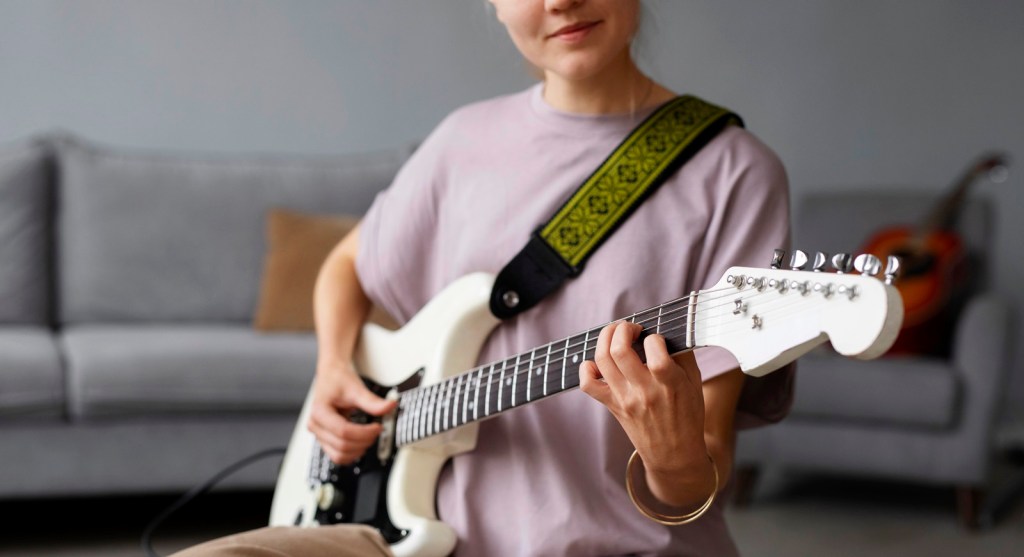 Um Gitarre zu spielen, musst du zuerst die Saiten stimmen.